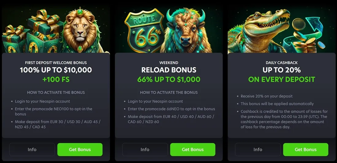- Reload bonuses on the weekend. You can get a 66% deposit bonus, up to $1,000. To make this bonus, you must deposit at least $40. You’ll also need the promo code 66NEO.